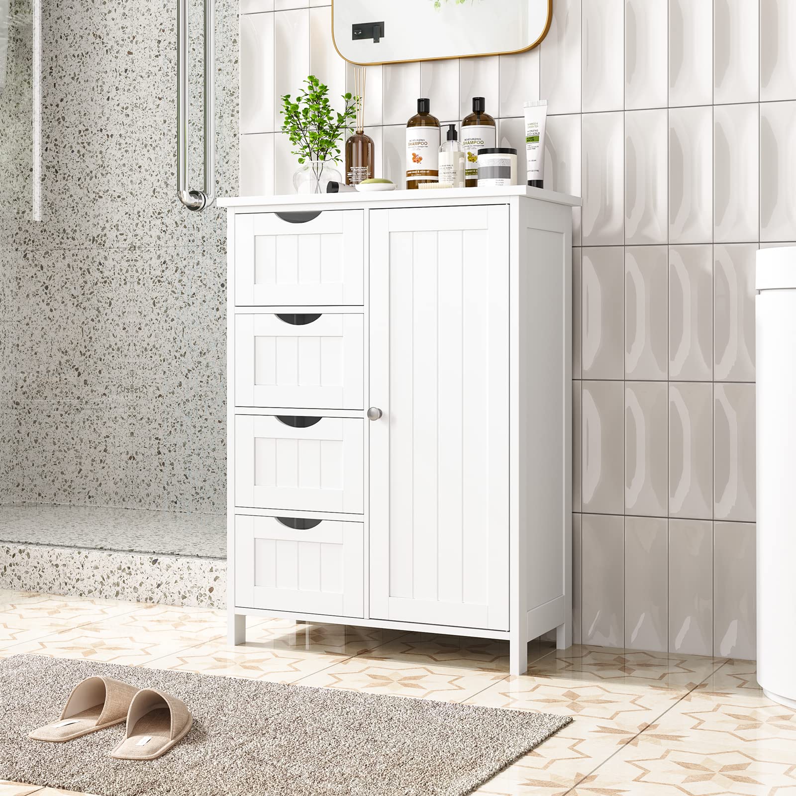 【Storage Master】: Our floor cabinet come with 4 large drawers and a cupboard for you to organize towels, shower gel and other bathroom supplies, the shelf inside the door is adjustable, making it easy to store higher bottles