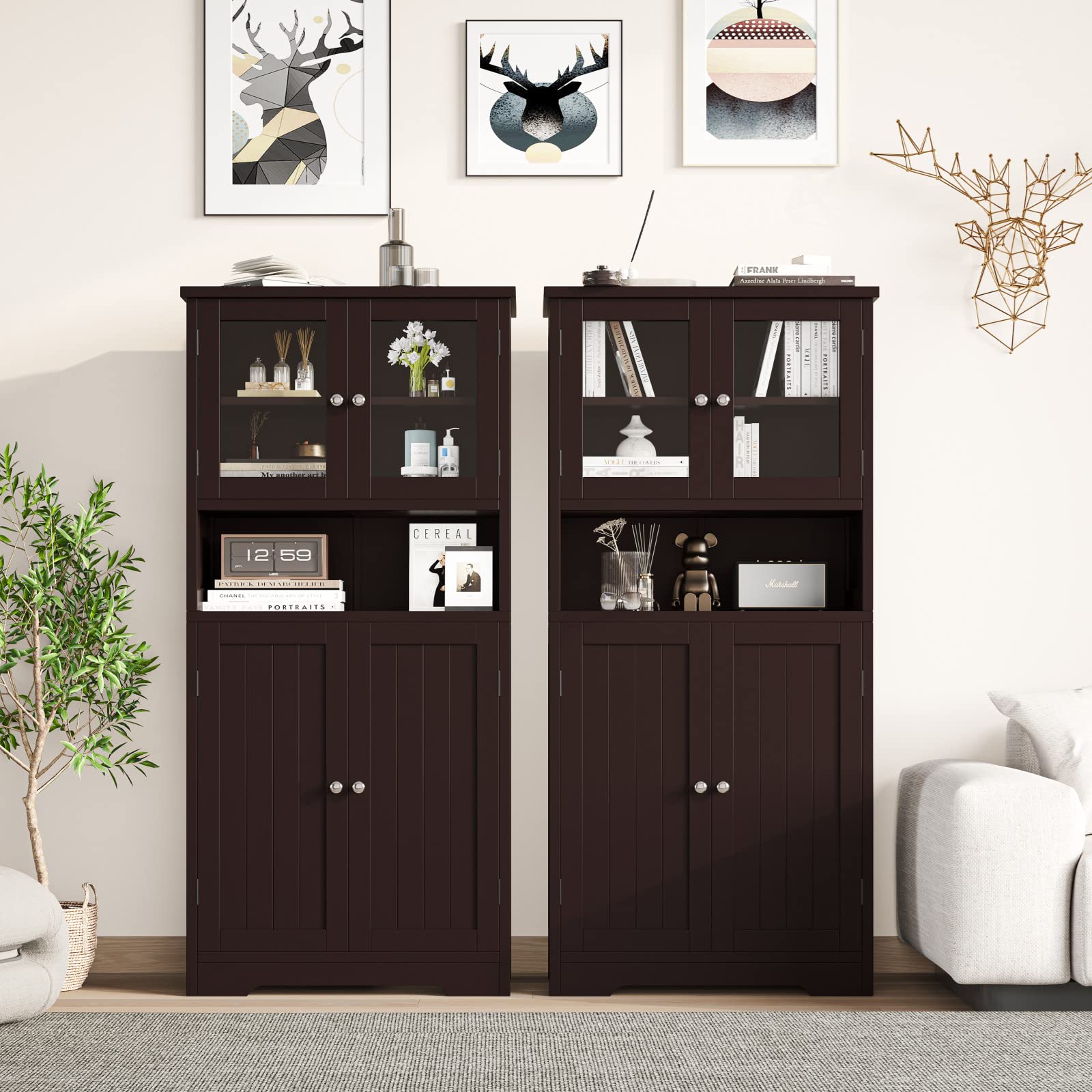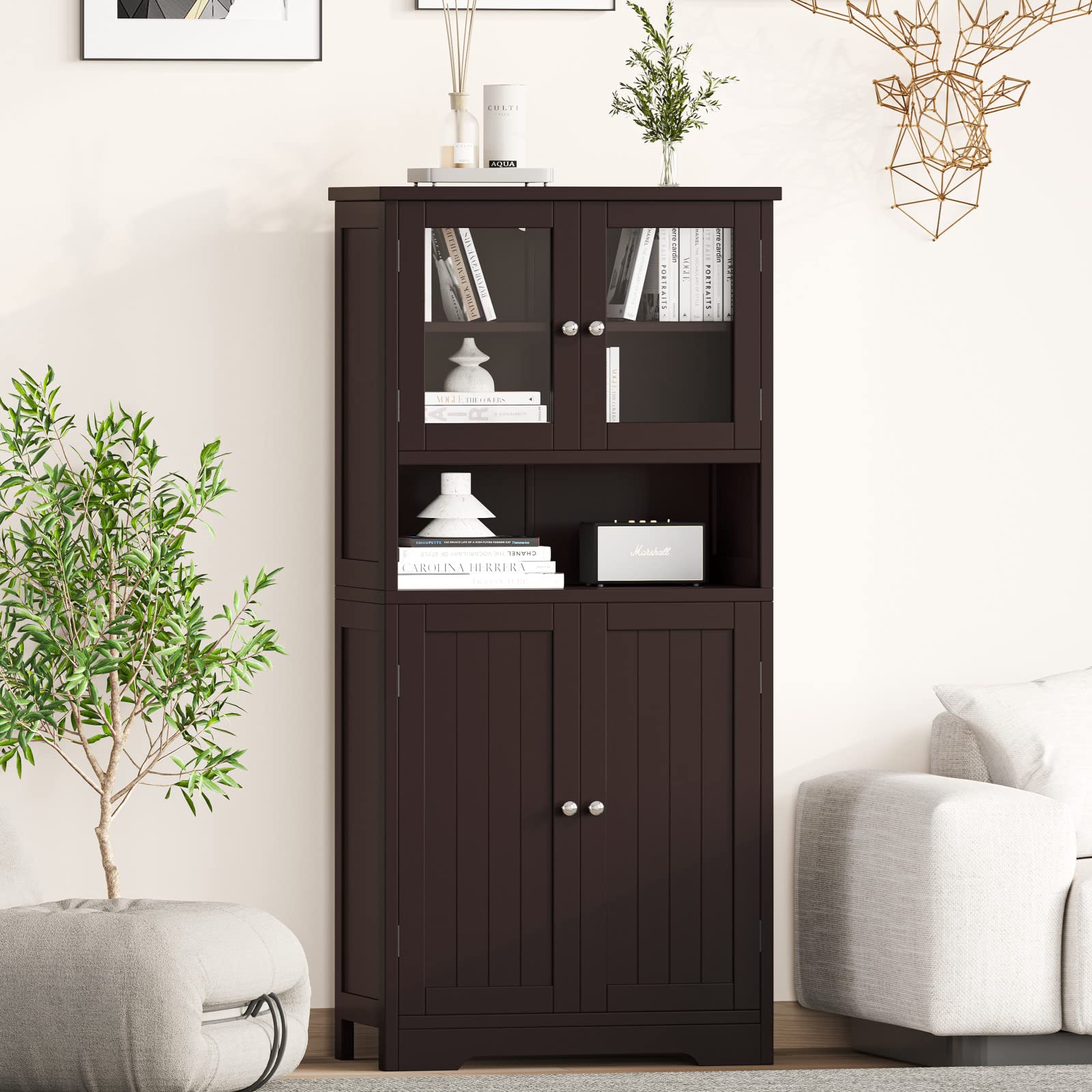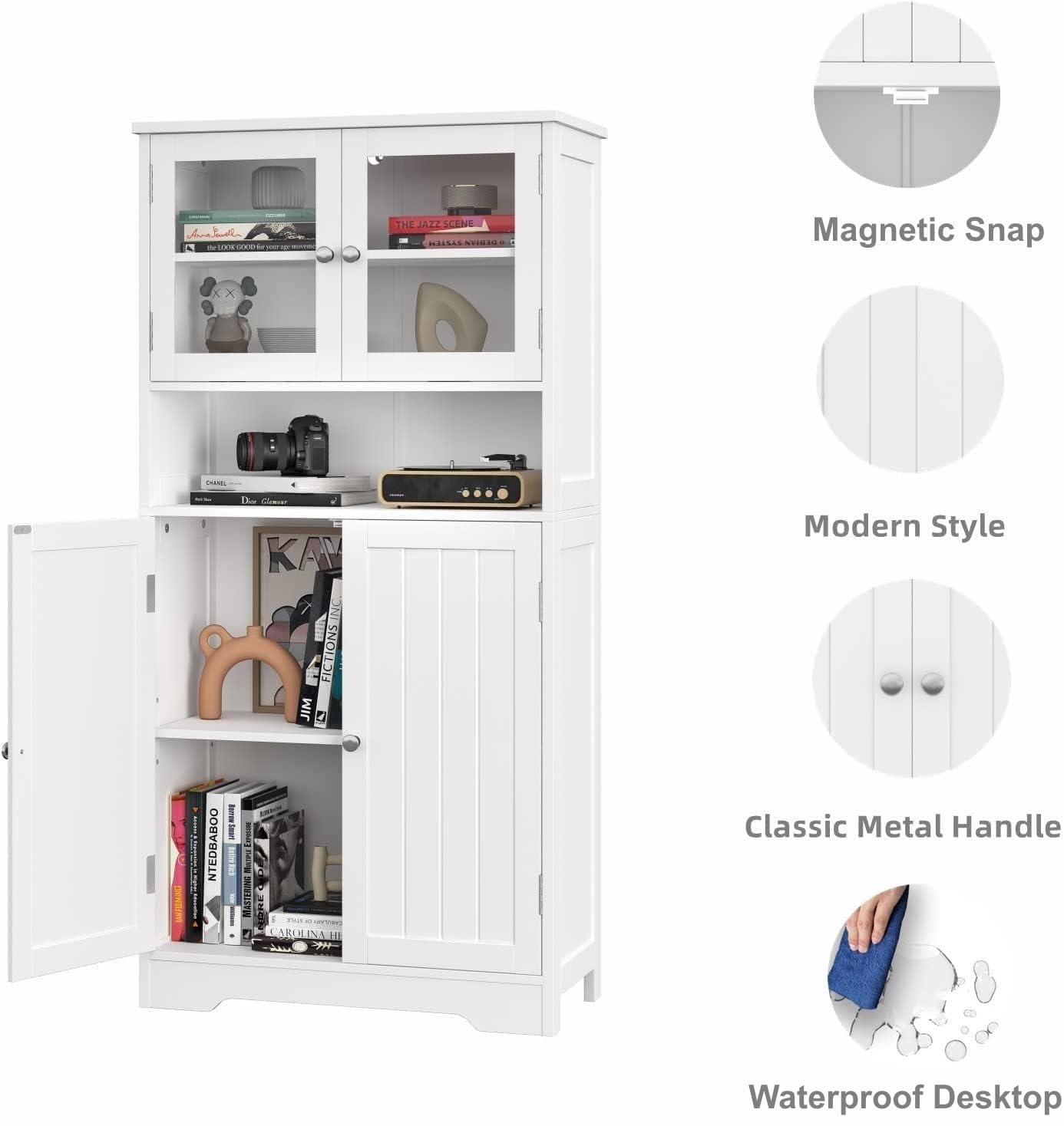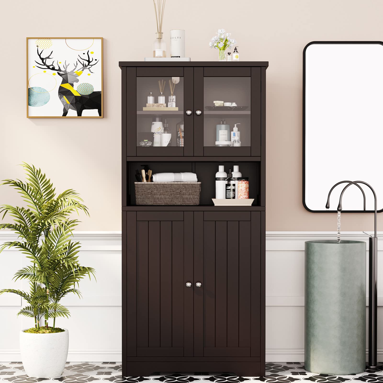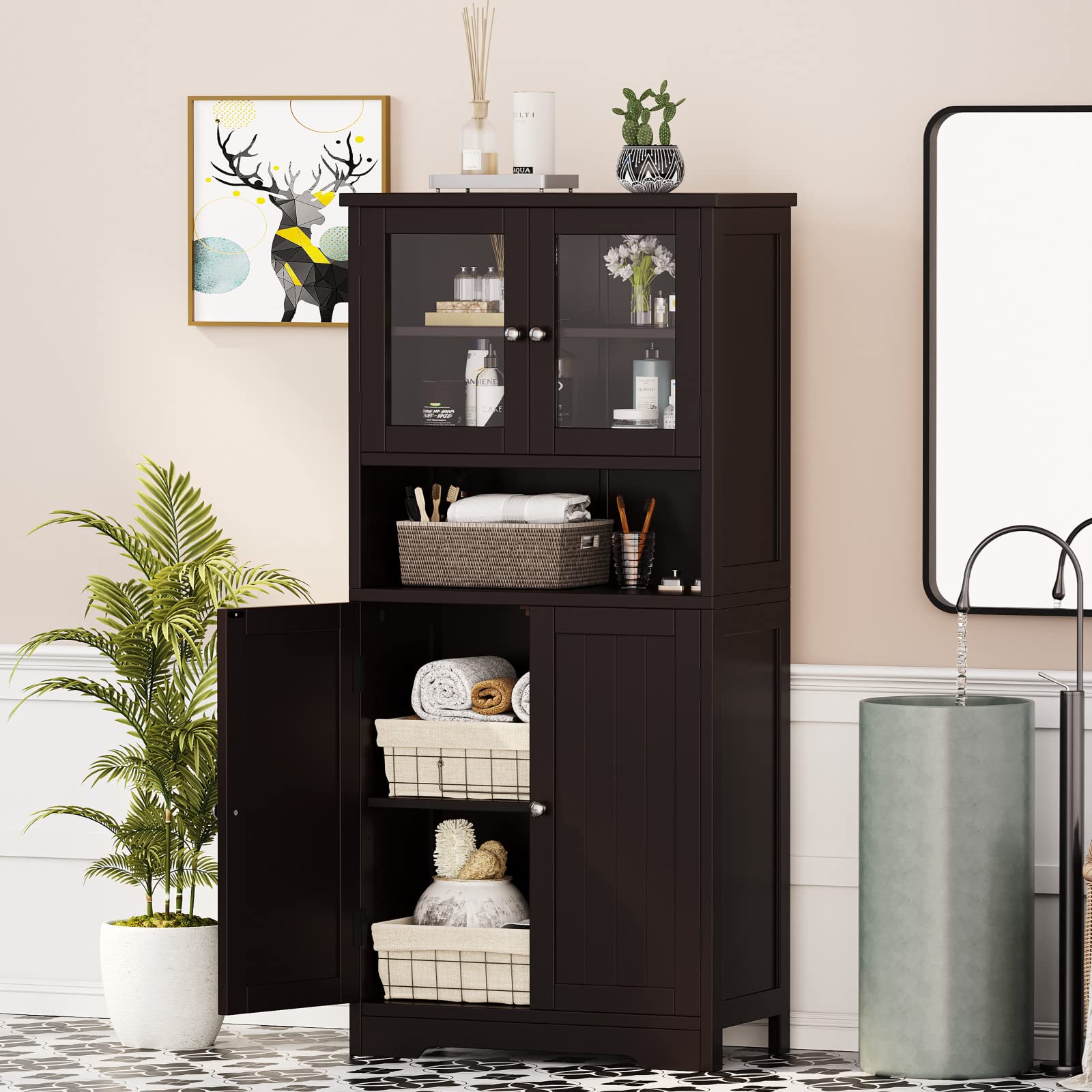 【Sturdy & Safety】: Made of high-quality MDF and EPA-grade particleboard, the overall structure isn't easy to shake, the glass doors are made of tempered glass, plus this bathroom floor cabinet is equipped with anti-toppling fitting to protect the safety of your family