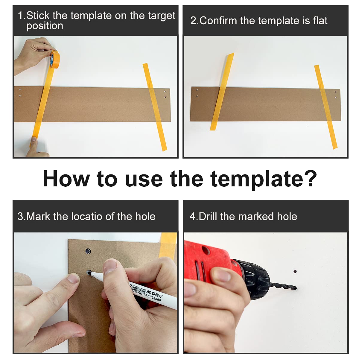 4.The template has the same size as the product. You can paste the template to the target position and mark the holes to improve your work efficiency and convenience. The tape will not harm the existing paint or tiles, please rest assured to use it.