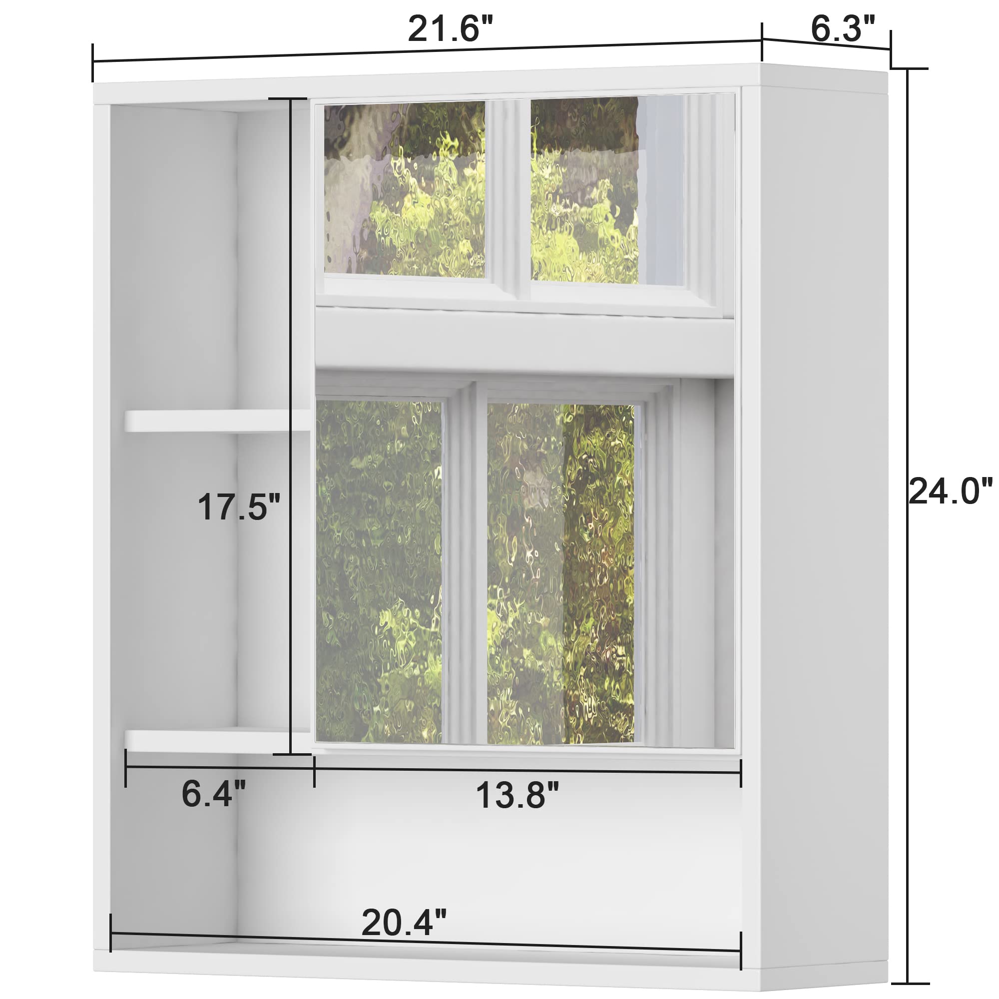 【Dimension & True All-rounder】Dimension: 21.6" L x 6.3" W x 24" H. This bathroom wall cabinet features a single mirror for your everyday makeup or shaving. It is a blend of mirror and cupboard which save your space and money as well.