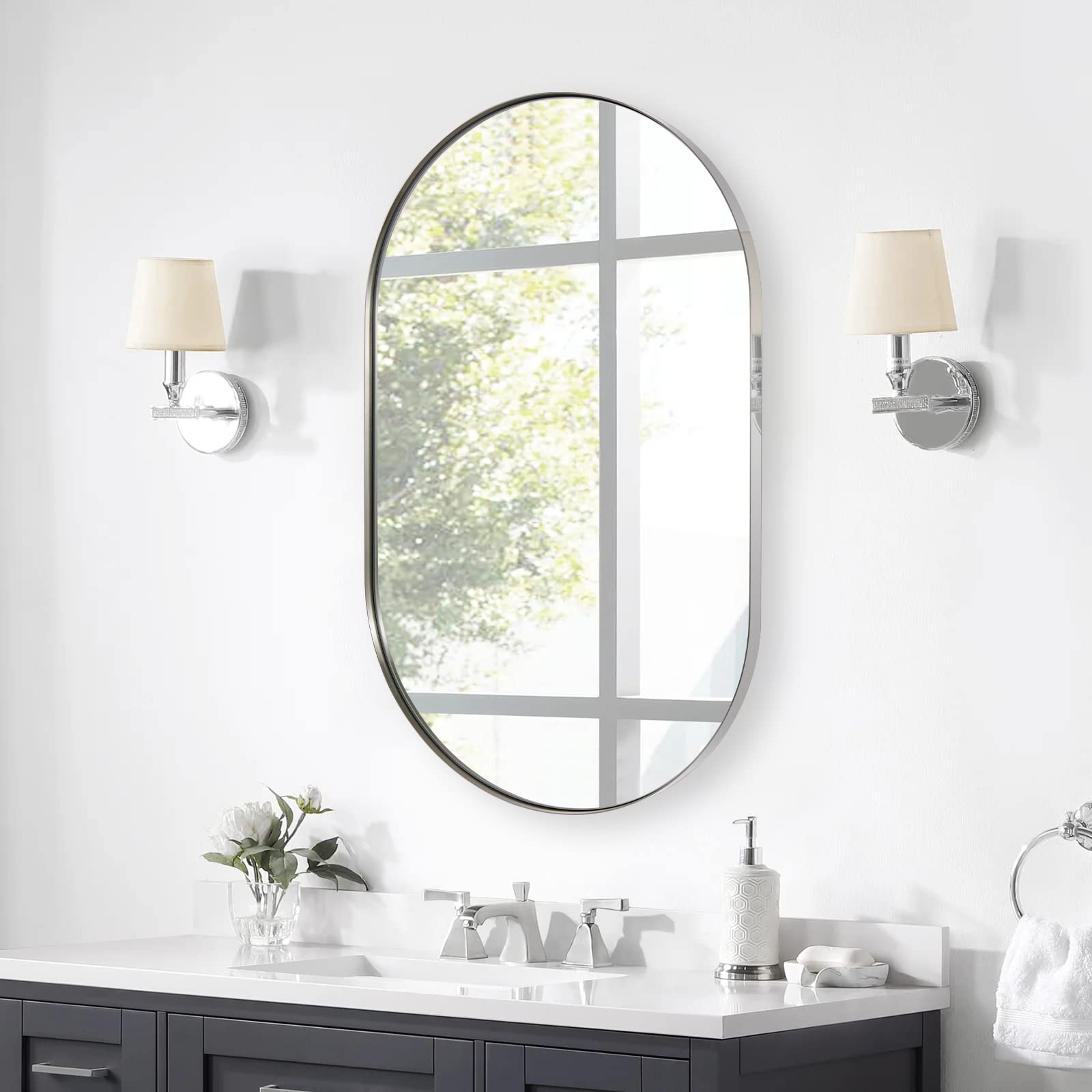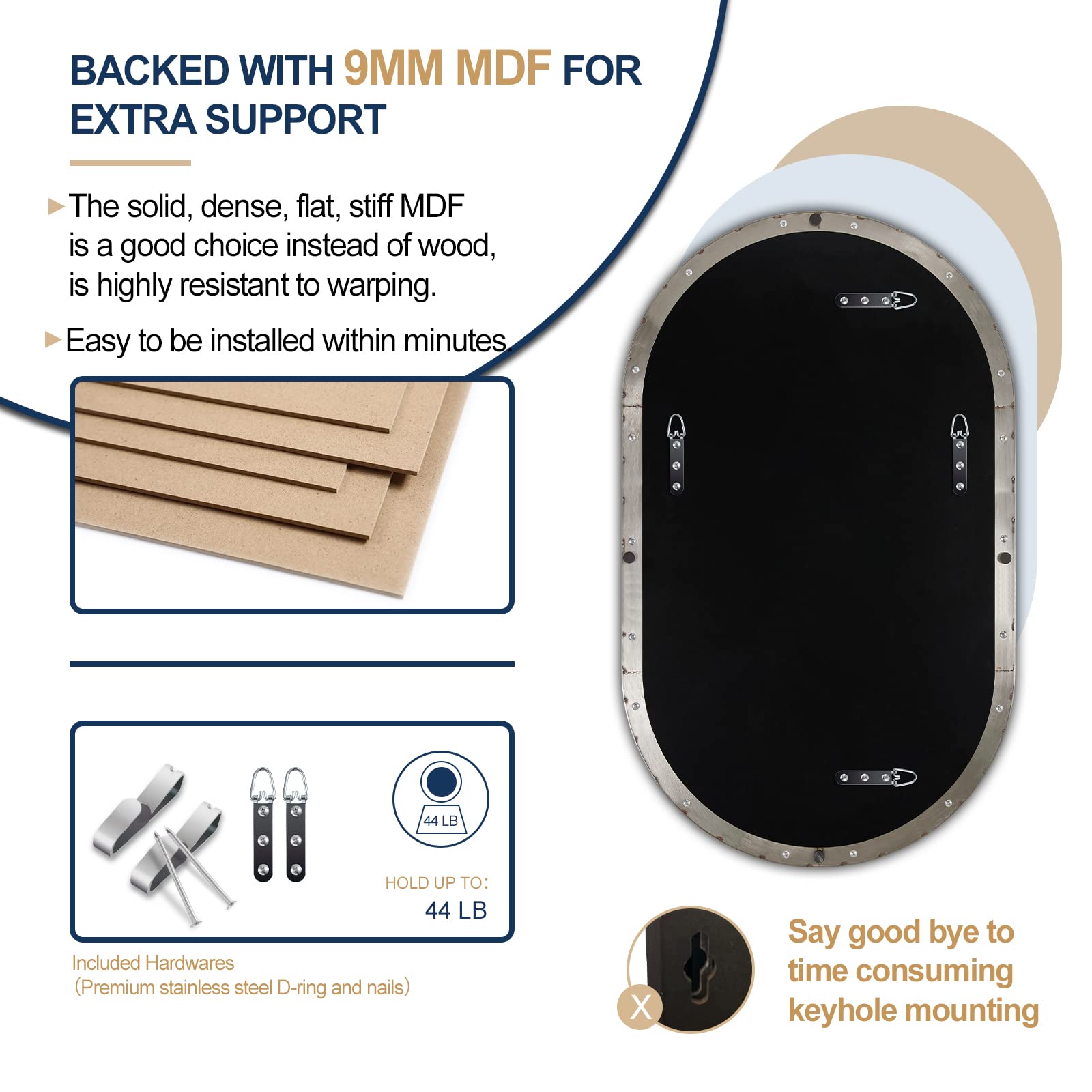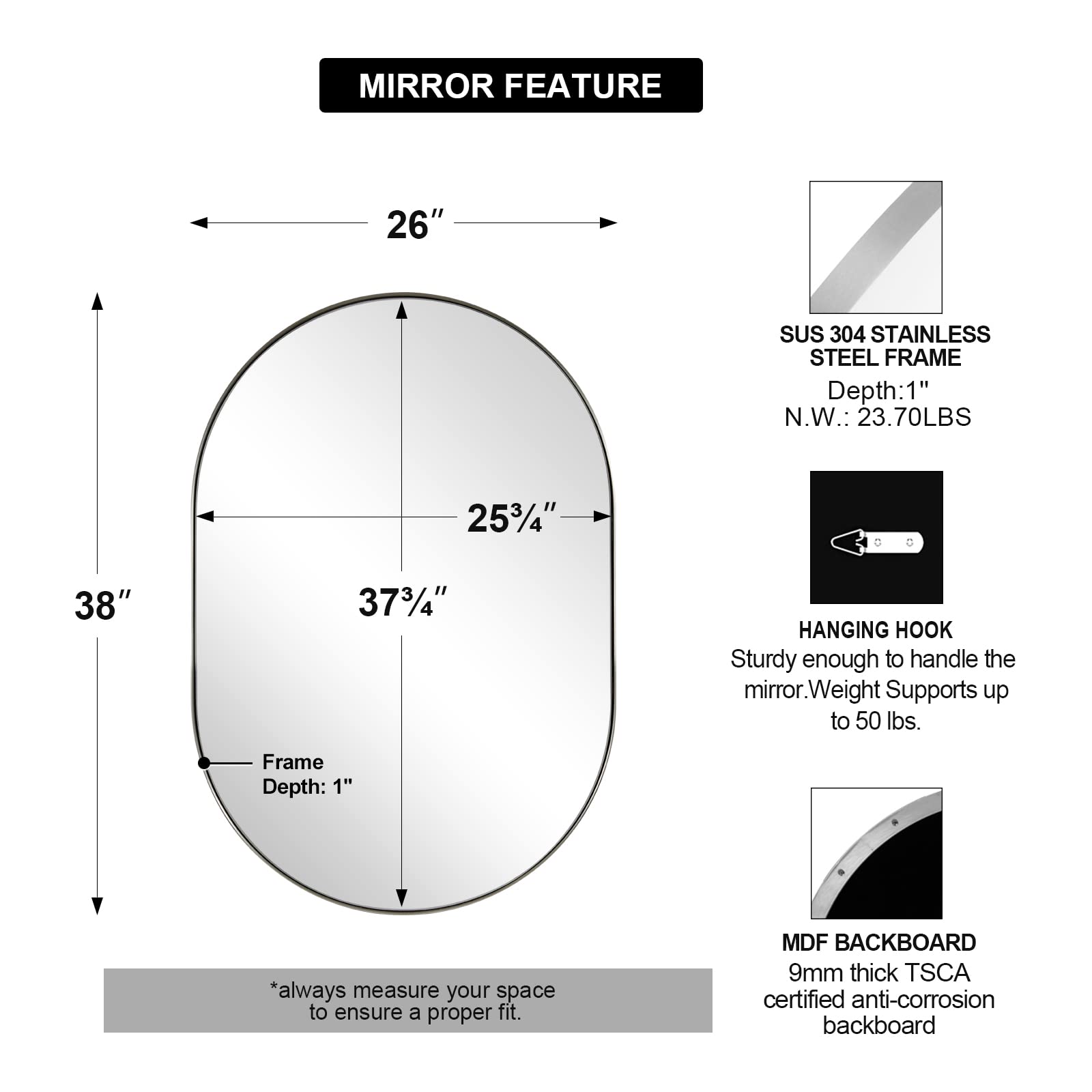 【STAINLESS STEEL METAL MIRROR】: Overall:20x33 inch, weighs 14.77lbs! From the weight, you would know how the exceptional quality material we choose for each oval mirror. To let each mirror stand by with time, we use the sleek SUS304 stainless steel frame with oxidation-resistant. 4mm HD glass supported by 9mm MDF backboard is surrounded by the metal frame to be anti-explosion.