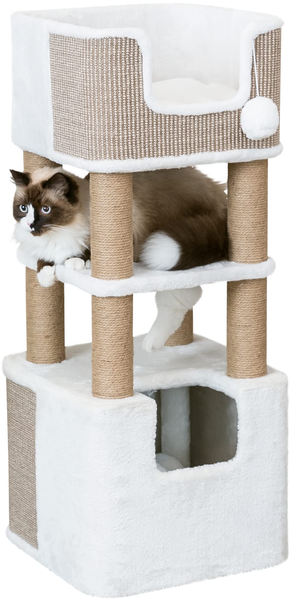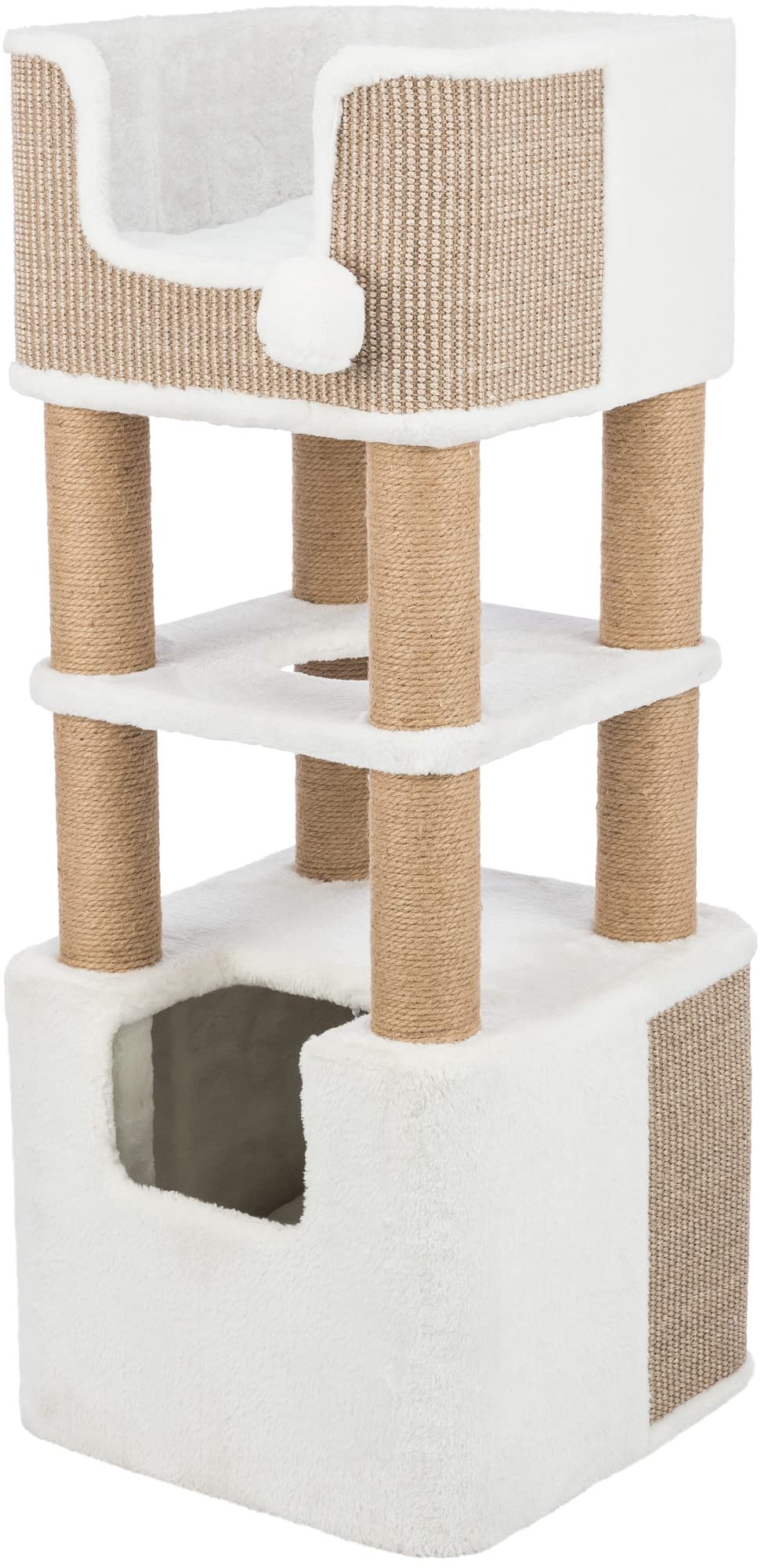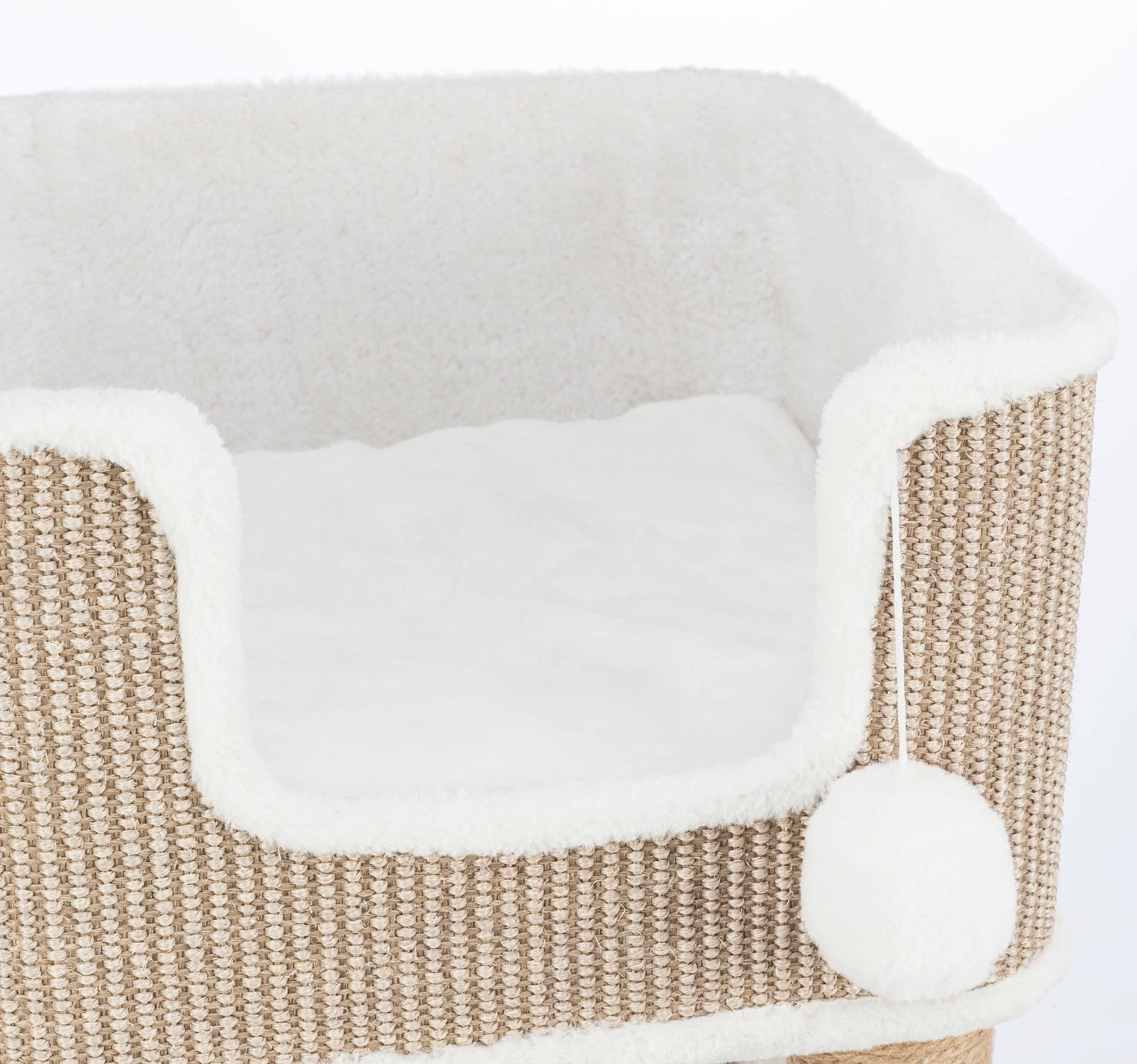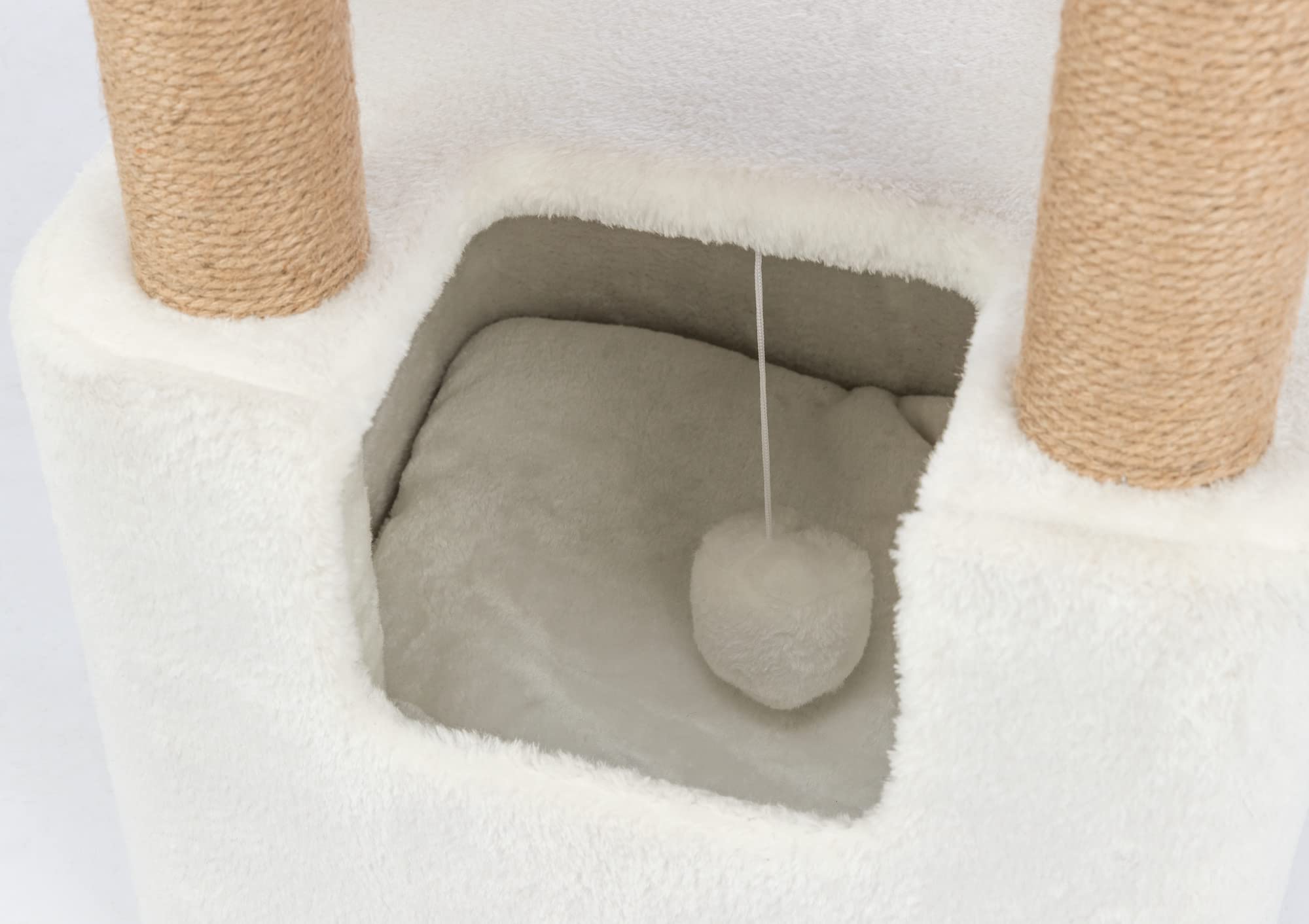 - 2 fluffy dangling pom-poms inside condo give kitty the thrill of the hunt as she bats them back and forth.Made from jute, the scratching posts are durable and safe for your pet to use