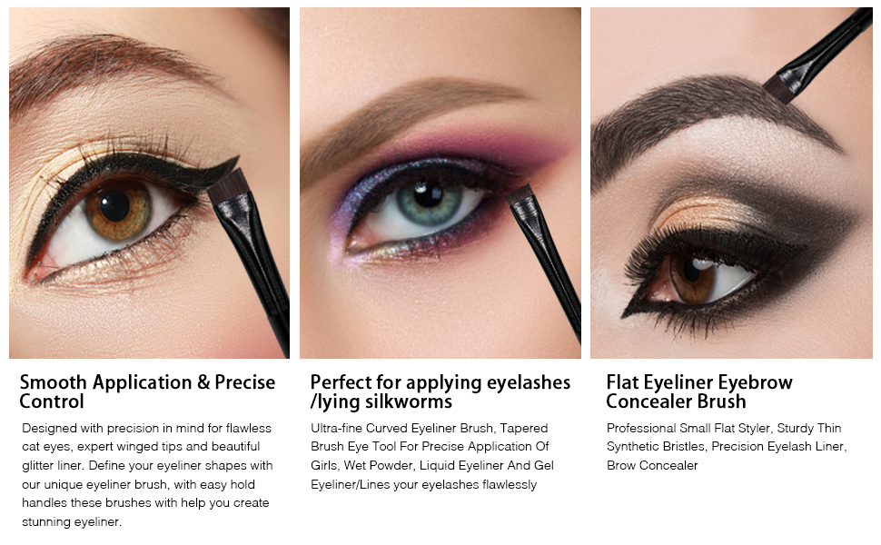 - Introducing our unique Eyeliner Brushes Set, designed to help you achieve flawless and precise cat eyes, expert winged tips, and beautiful glitter liner. Our brush features an angled premium hair brush tip, perfect for creating clean and sharp eyeliner edges. The easy-to-hold handle ensures that you are able to effortlessly achieve stunning eyeliner, making it a perfect addition to any makeup routine.