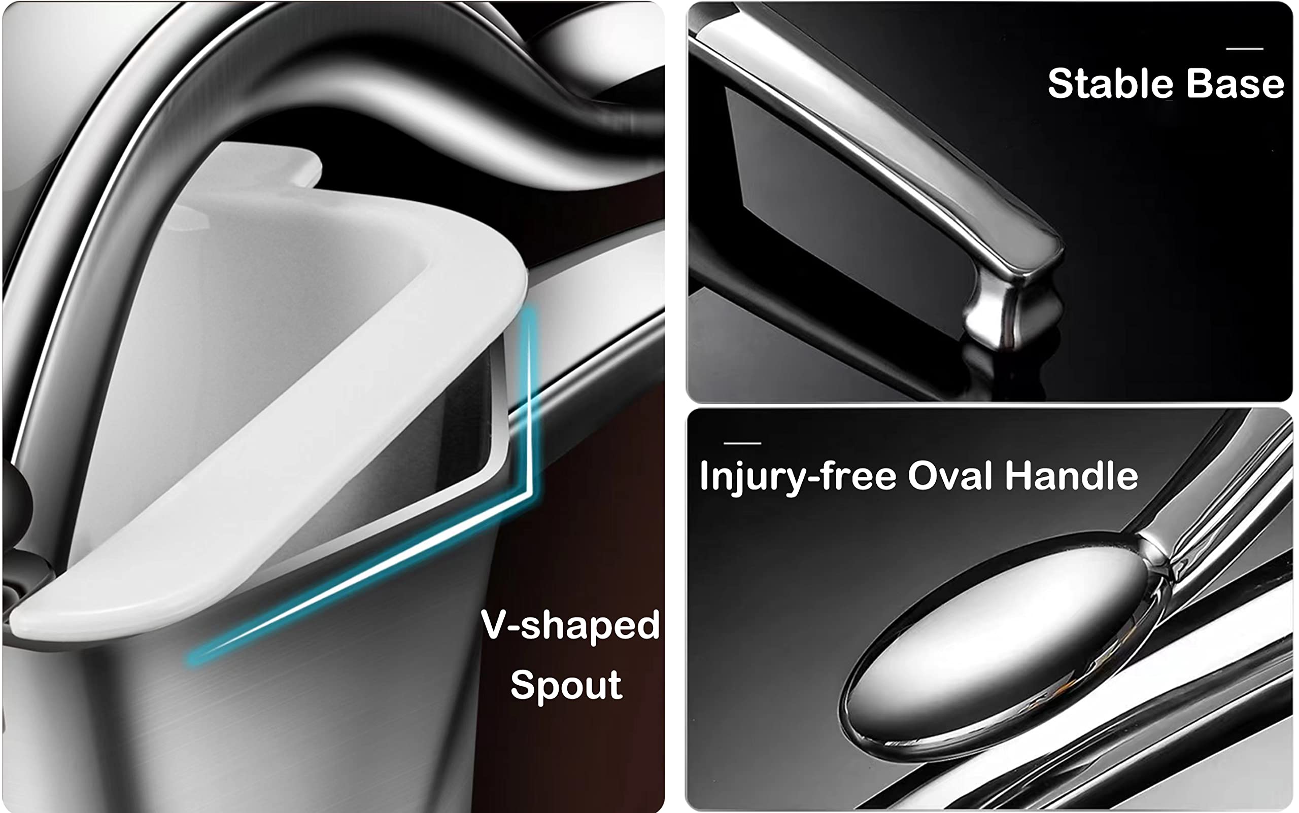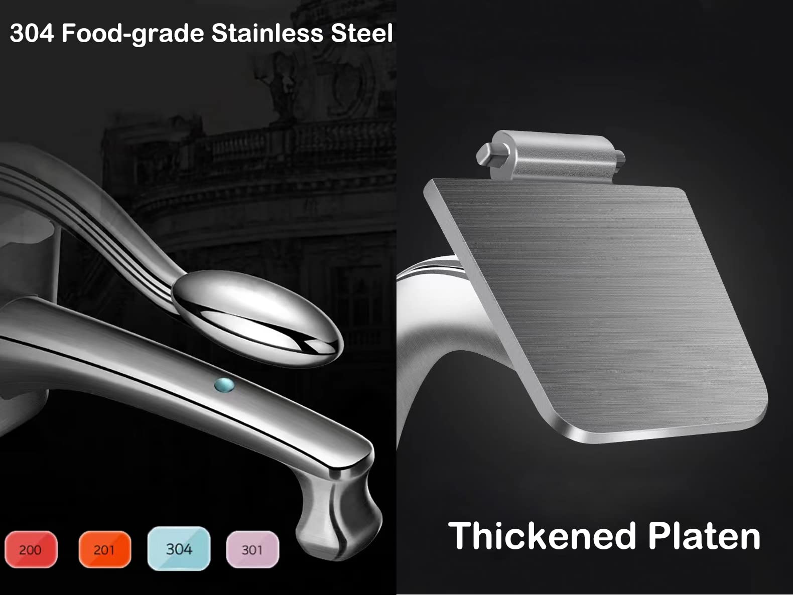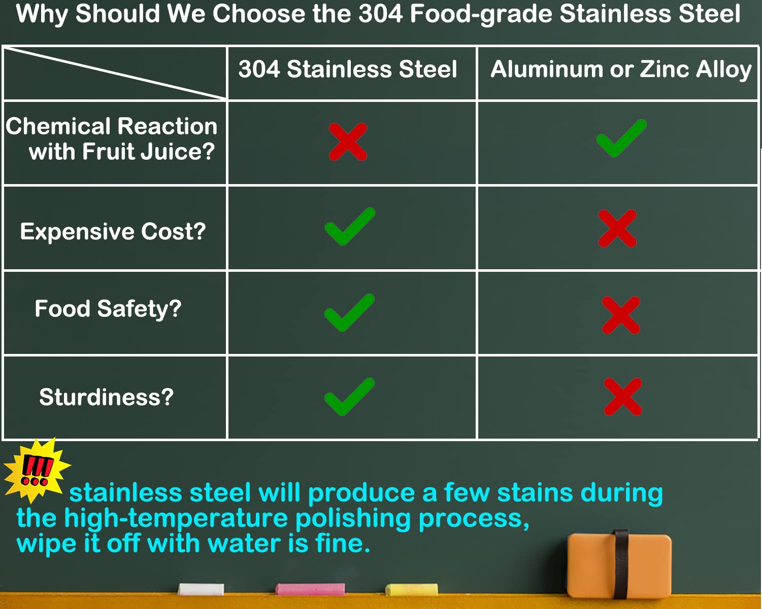 💯% food-grade 304 stainless steel juicer, non-toxic certified, lead-free material, it is secure and reliable,please do not compare the price of our squeezer with the fake cheap aluminum squeezer on the market, nobody wanna discount their HEALTH. (NOTE❗stainless steel will produce a few stains during the high-temperature polishing process, just wipe it off with water)
