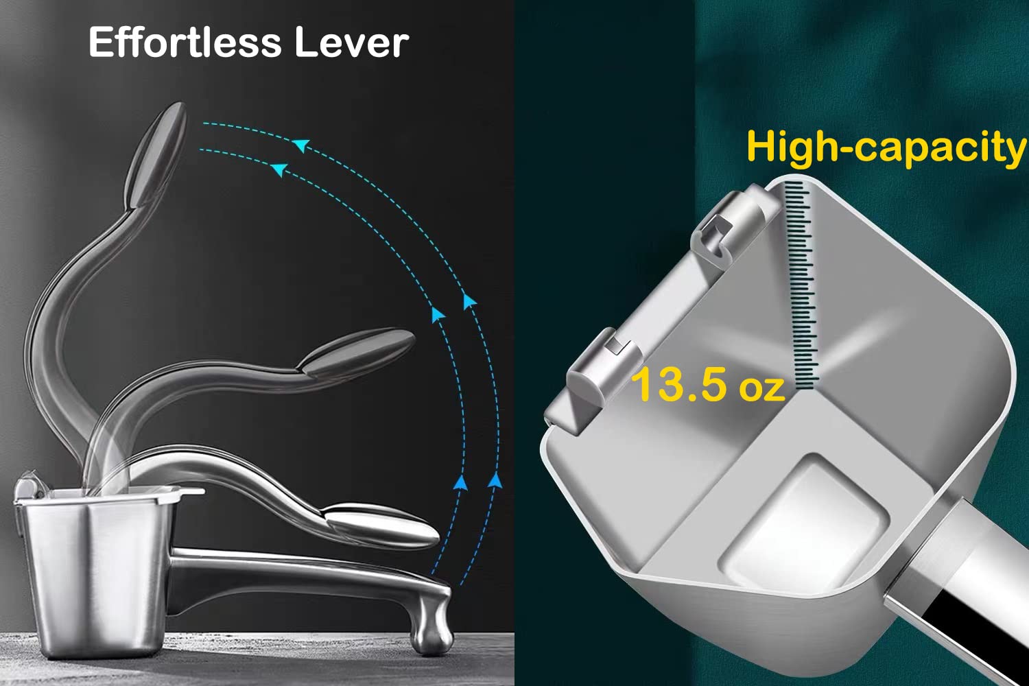 Designed with a comfortable grip and ergonomic handles, this squeezer allows for easy operation without straining your hands. Its efficient design maximizes juice extraction while minimizing effort, giving you more juice with less work.