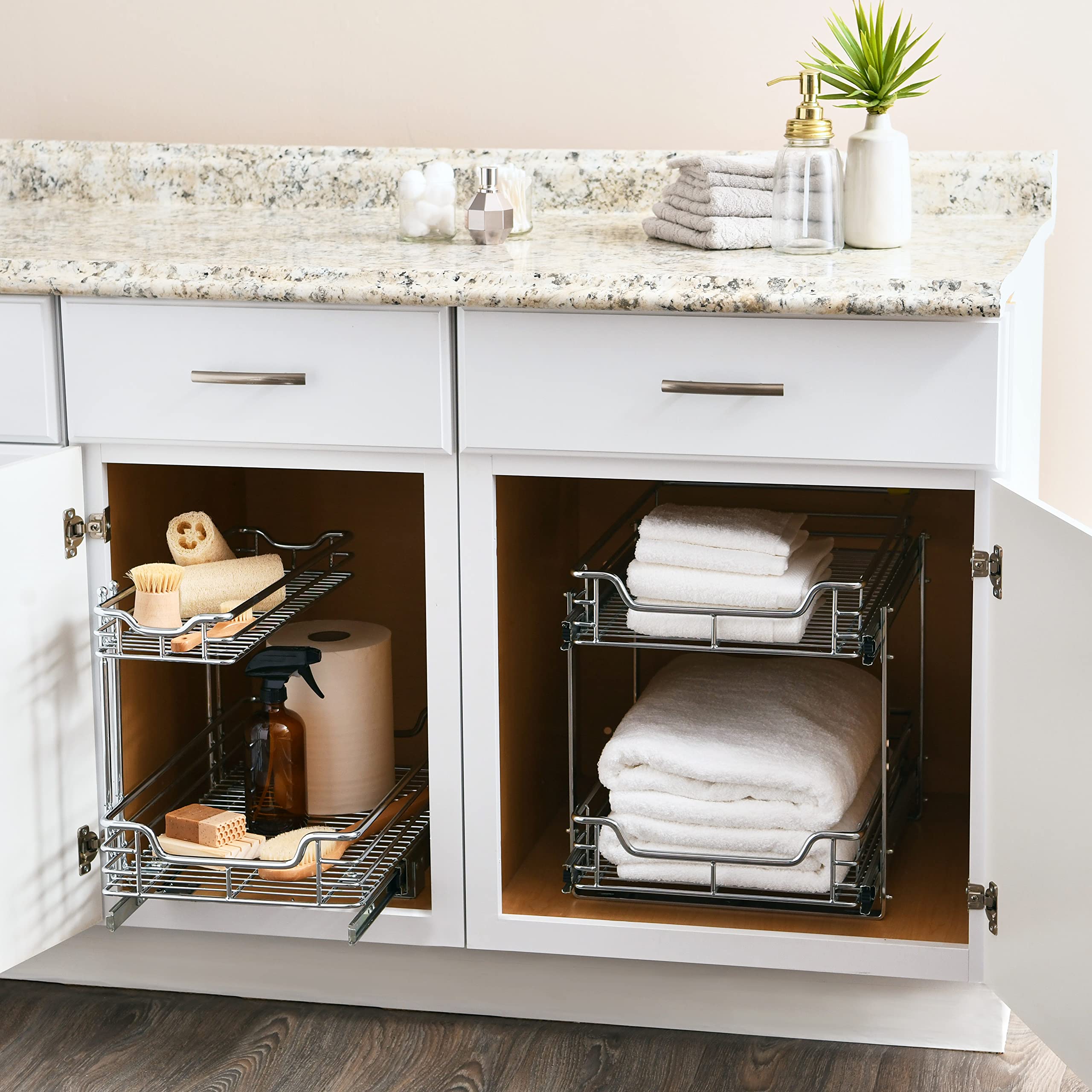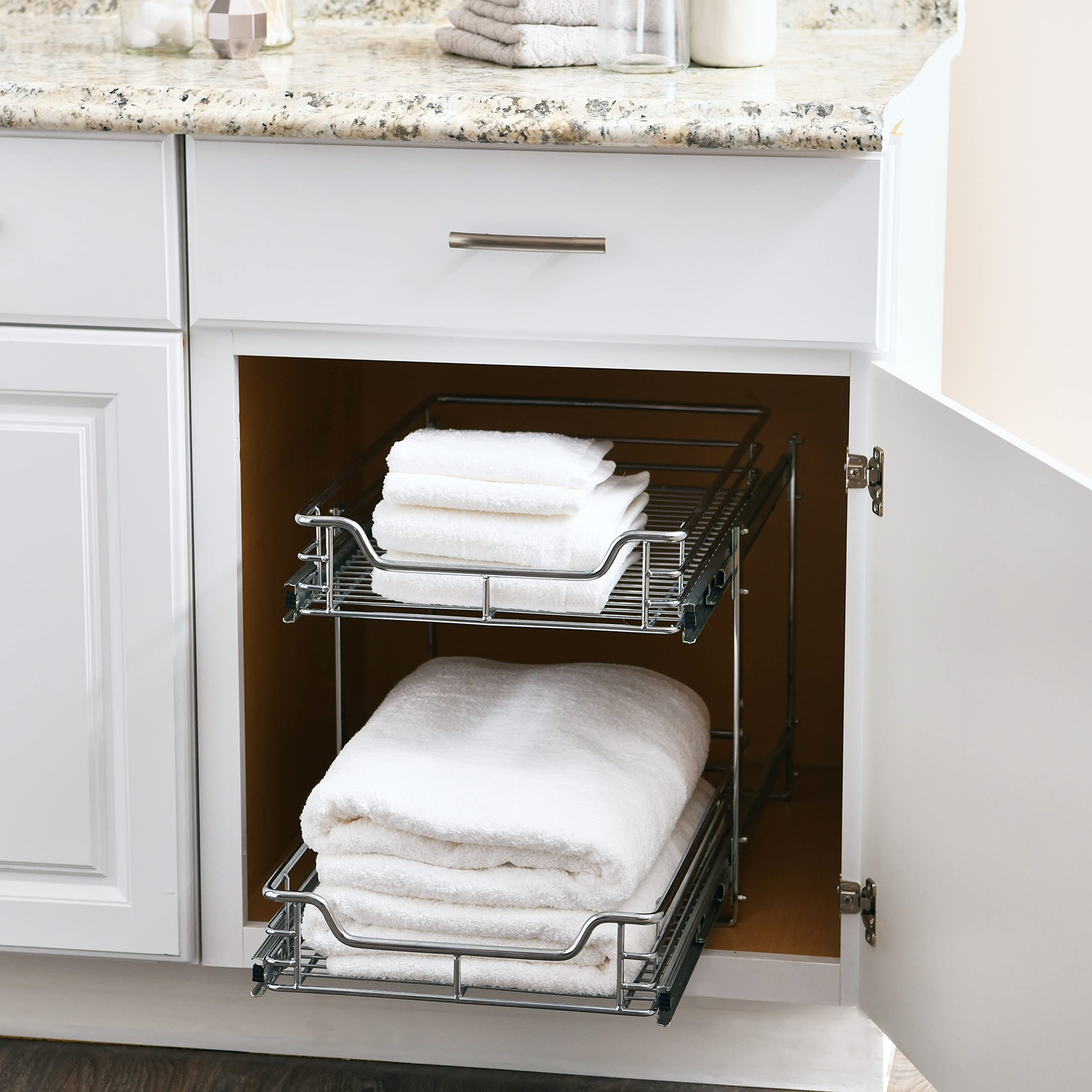 - Heavy-duty 2-tier under cabinet extra deep pull out chromed wire storage shelf for kitchen and bathroom