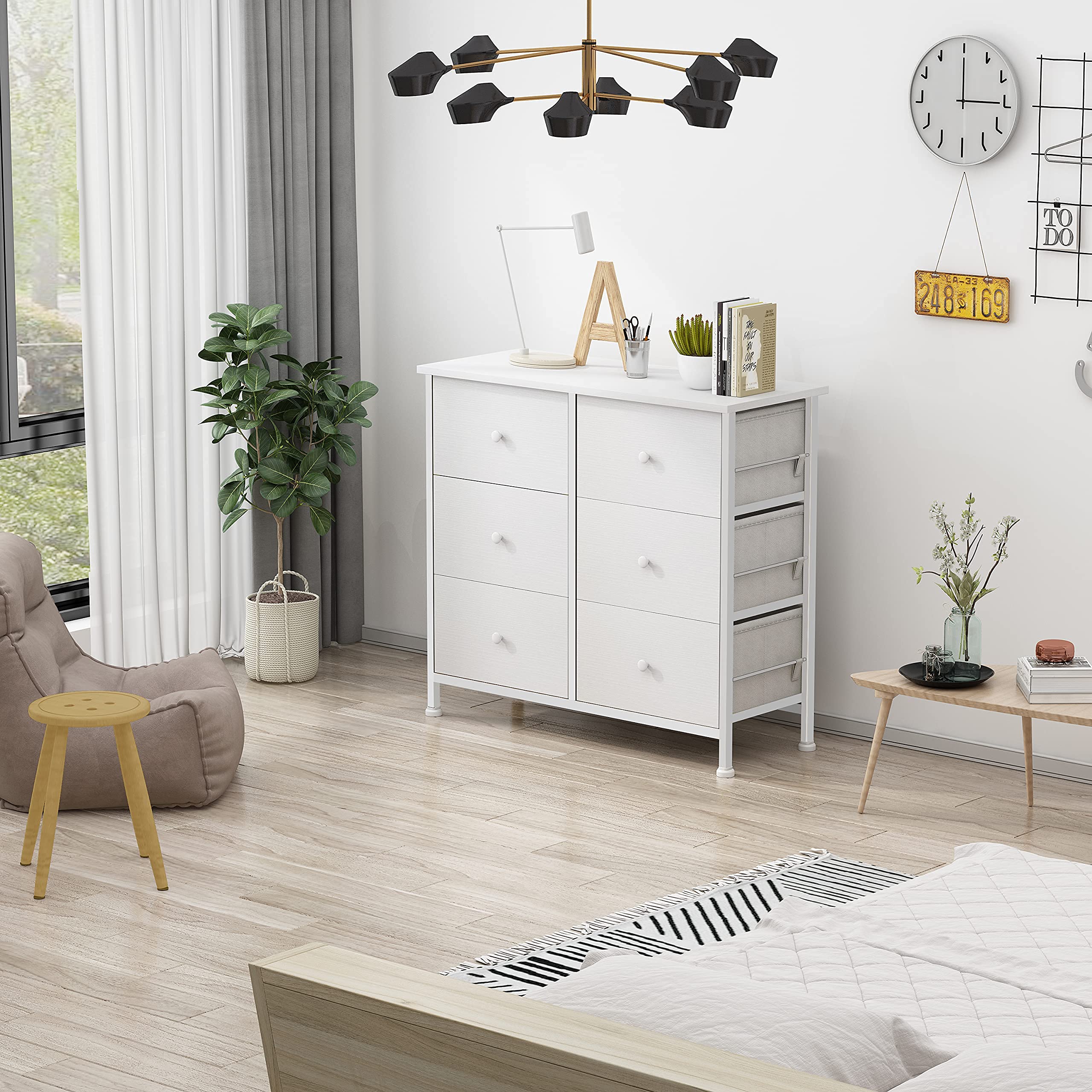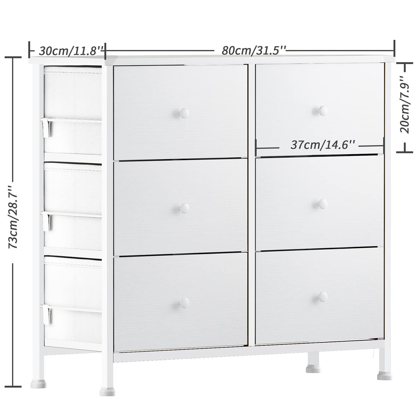 [White Dressers & Chests of Drawers]: Features 6 removable storage drawers made of high-quality non-woven fabrics, wooden front , Wooden handle is not only convenient but also beautiful,no matter kids or adult. Overall dimension: 31.5''*11.8''*28.7''. Drawer dimension: 14.6’’*11.8’’*7.9’’.