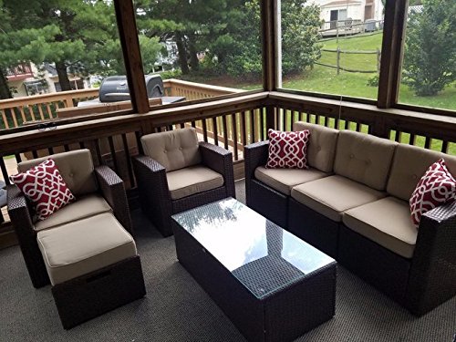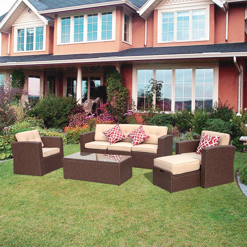 【Comfy Beige Cushion】 patio chairs/sofa come with cushions and throw pillows. if needed cushions can be taken away from the seats to your preference. No warping, there will be no visible sun damage and no soak feeling after a long period of use. Tips: On rainy days, it's good to your set to flip the cushions over so the side you sit on doesn't get wet. And on sunny day, we are sure it will slow down the aging considerably and keep the original color if your set doesn't sit in direct sun.