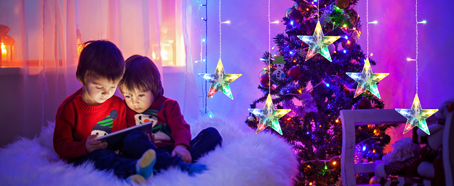 - ⭐【IP44 Waterproof & Indoor Outdoor Use】Our Star Curtain Lights and battery box are IP44 Waterproof and Snowproof, perfect for Indoor and Outdoor, Christmas, Window, Garden, Party, Home, Festival, Holiday, Ramadan easter, etc. (NOTE: The Star Curtain Lights do not include 3*AA battery.)