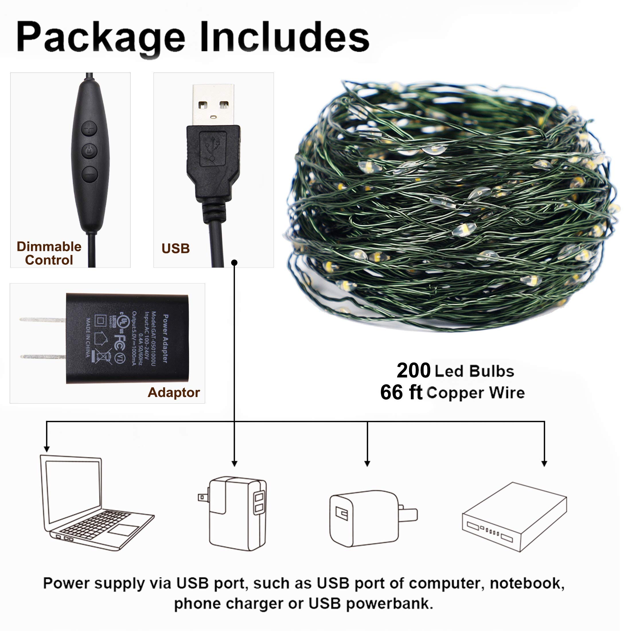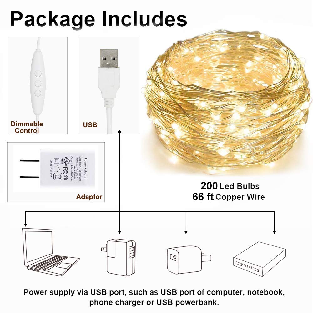 Wire Decorative String Lights: 66ft length 200 LED Warm White Christmas fairy string lights are made from high quality copper wire. Good ideal design for decorate indoor and outdoor. Add warm and charming atmosphere to any space.