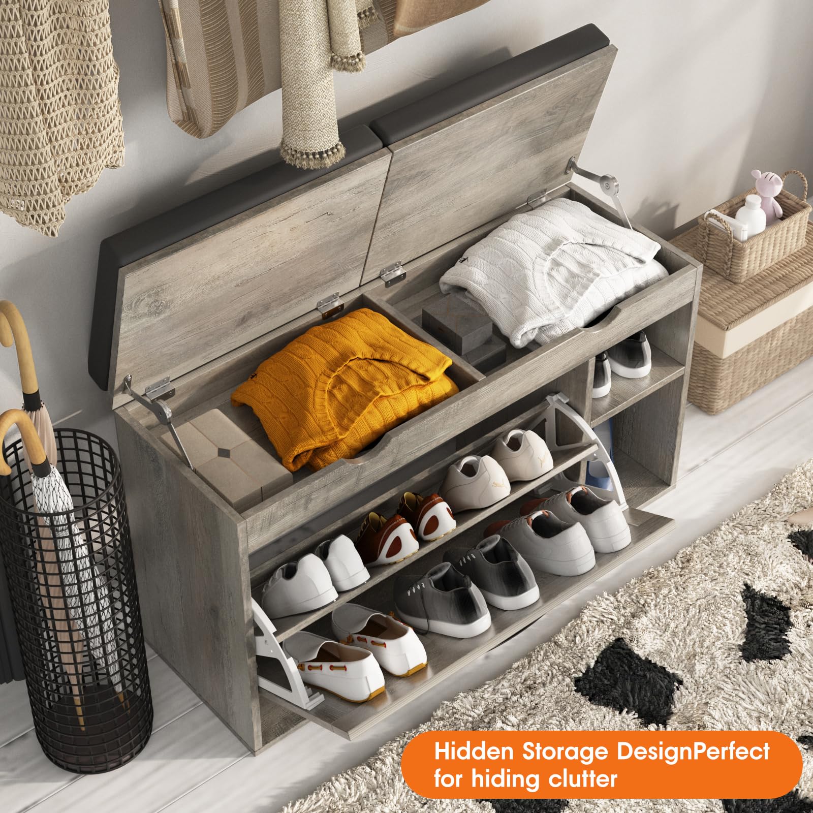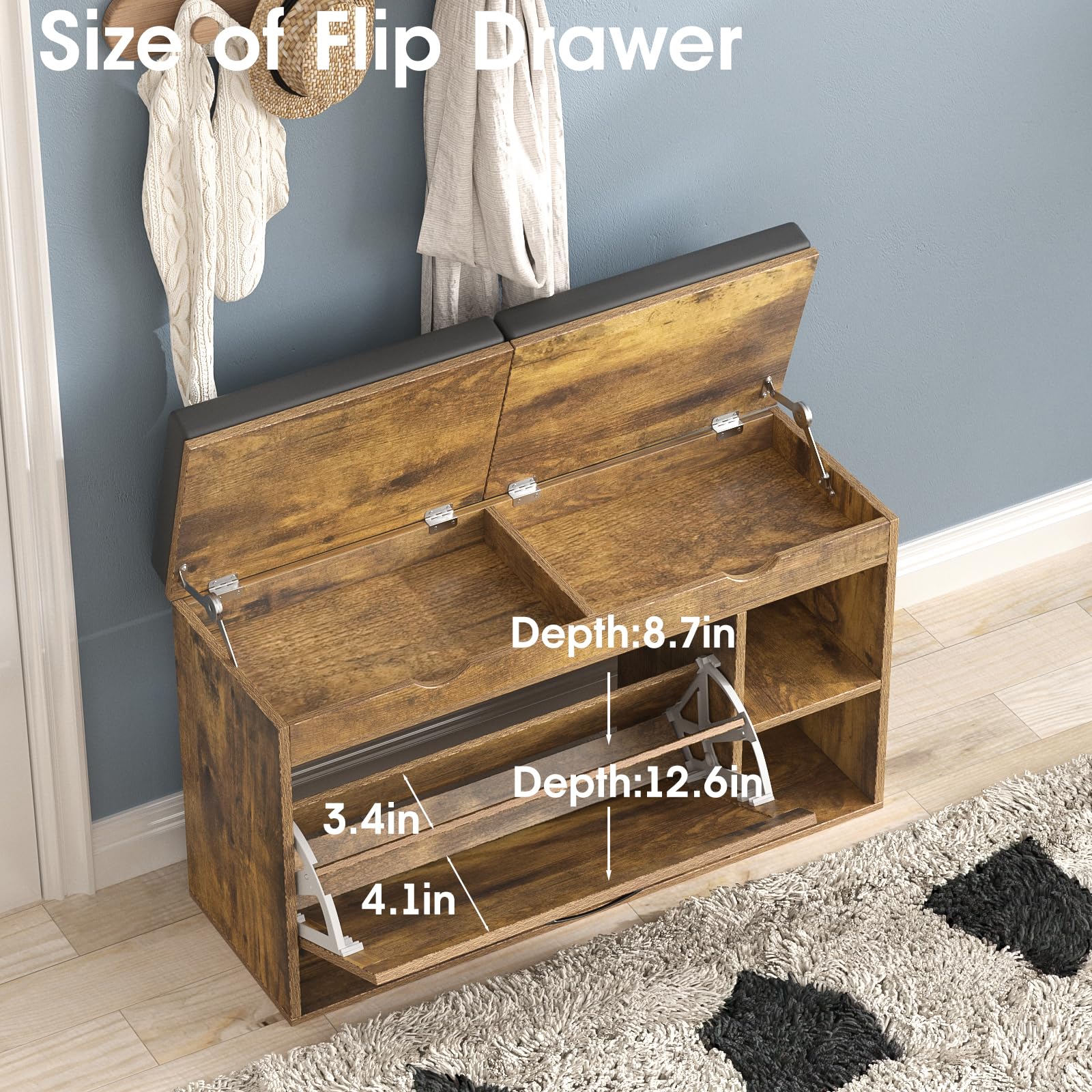 Crafted with durable materials, this shoe storage bench provides a sturdy seating area for putting on and taking off shoes. The flip drawer conceals shoes, maintaining a clutter-free and organized space, while also doubling as a convenient bench for additional seating.