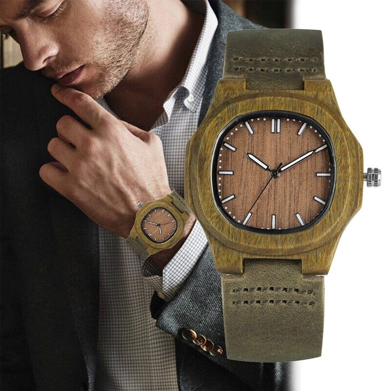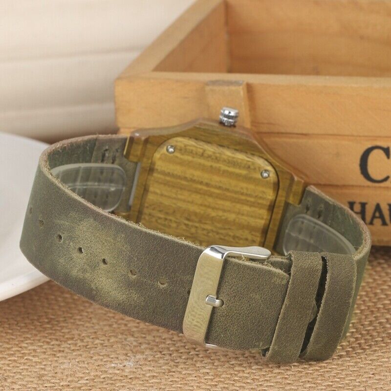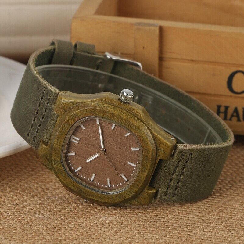 Wooden Wristwatch for Boys Classic Appeal: Emphasize the classic appeal of the wooden wristwatch for boys. The combination of green wood, durable leather, and a concise brown dial creates a timeless accessory suitable for boys who desire a classic choice that complements their evolving taste.