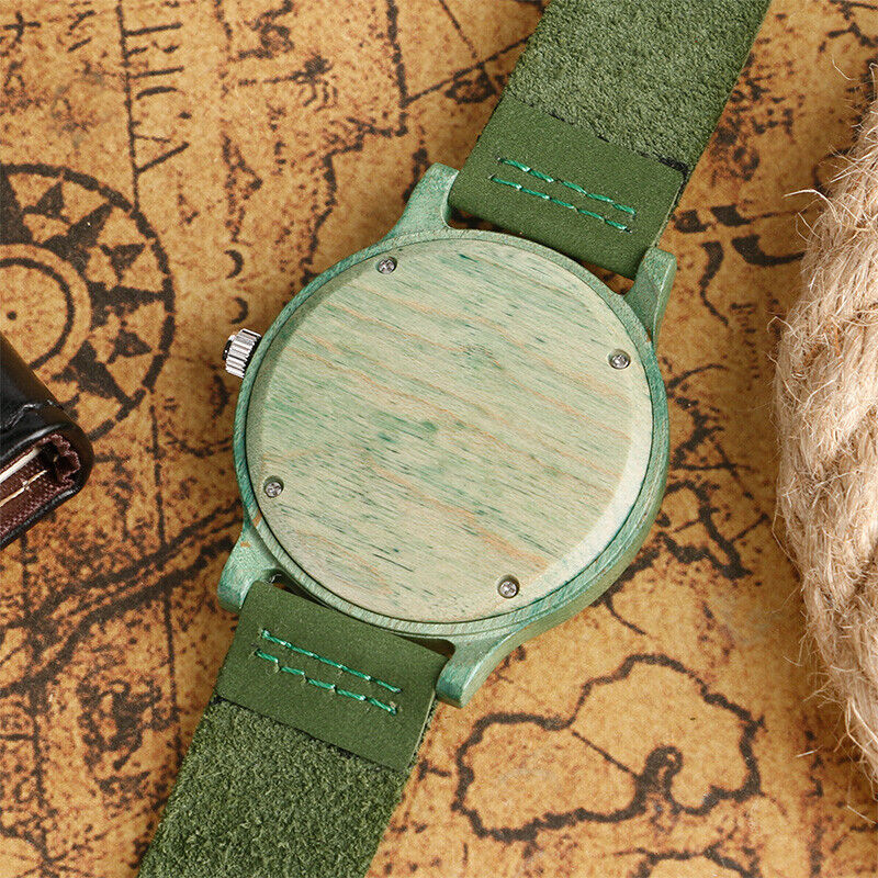 【Stylish Green Leather Band for Modern Appeal】 Adorned with a stylish green leather band, the watch adds a modern and stylish appeal to its overall design. The fusion of green leather with the natural wooden frame creates a striking contrast, making it a versatile accessory suitable for both casual and formal settings. It's a fashion-forward choice for individuals who value contemporary aesthetics.