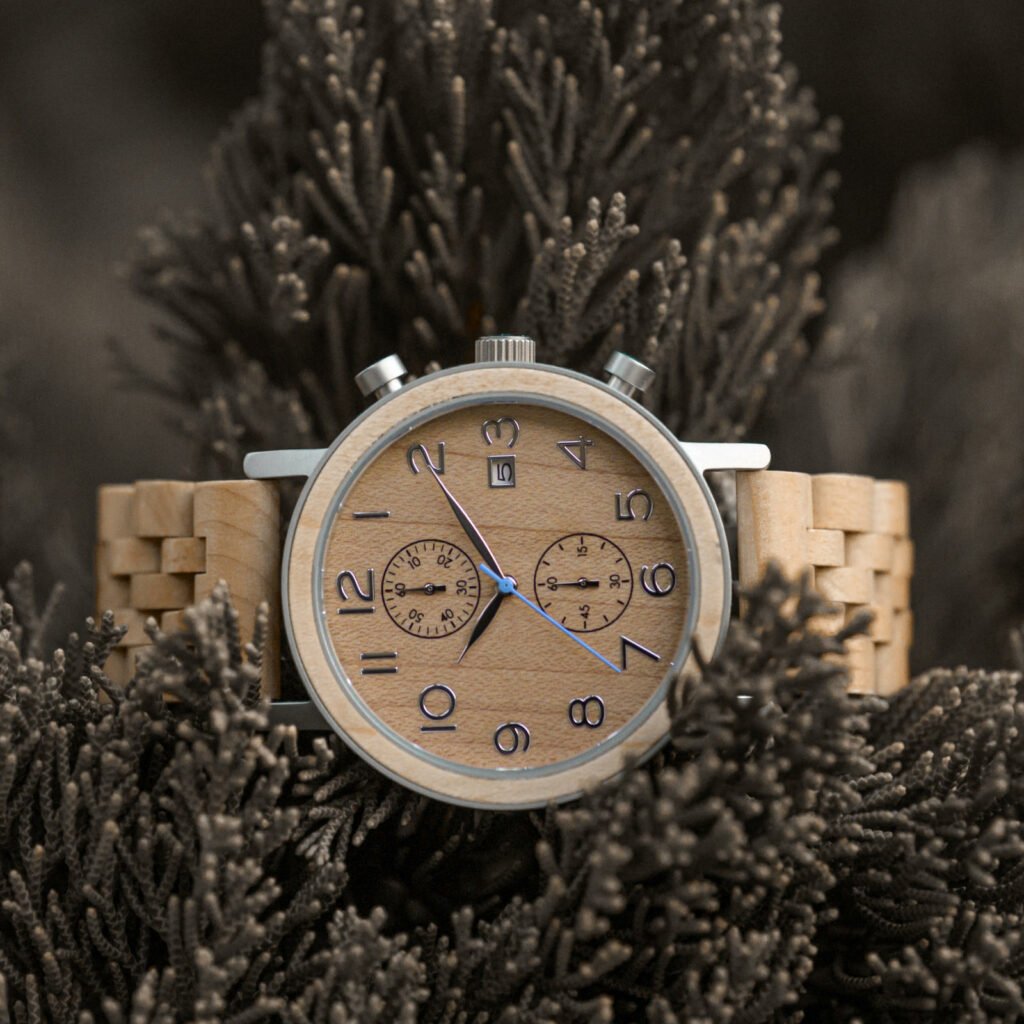 Natural Maple Wood Timeless Elegance Showcase: Showcase the timeless elegance of the watch's natural maple wood case. The natural grain patterns and warm tones of the wood create a visually stunning accessory that serves as a testament to the beauty of nature.