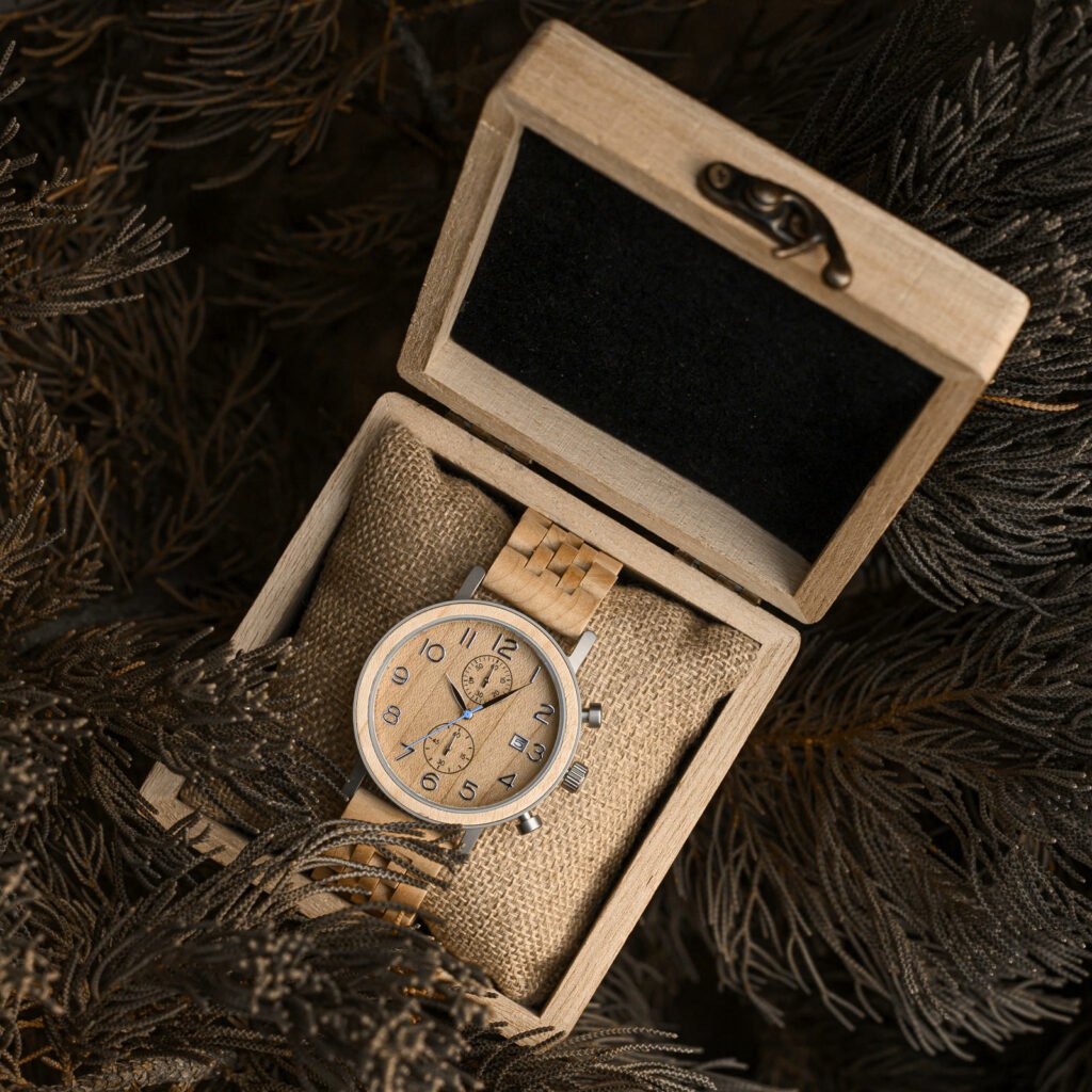 The watch's case, made from natural maple wood, embodies timeless elegance. The natural grain patterns and warm tones of the wood create a visually stunning accessory that stands out. It serves as a testament to the beauty of nature, offering wearers a touch of warmth and sophistication in their daily style.