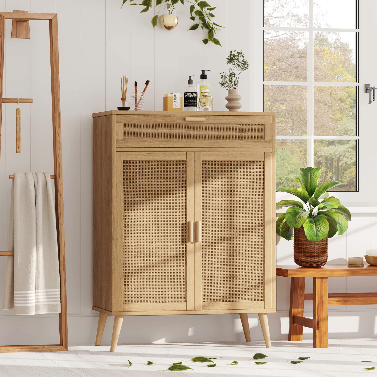 Chic and Practical Design: This floor storage cabinet with rattan doors offers a blend of elegance and functionality, ideal for your bathroom or any space requiring additional storage. Its sophisticated rattan doors and large drawer combine to create a stylish storage solution.