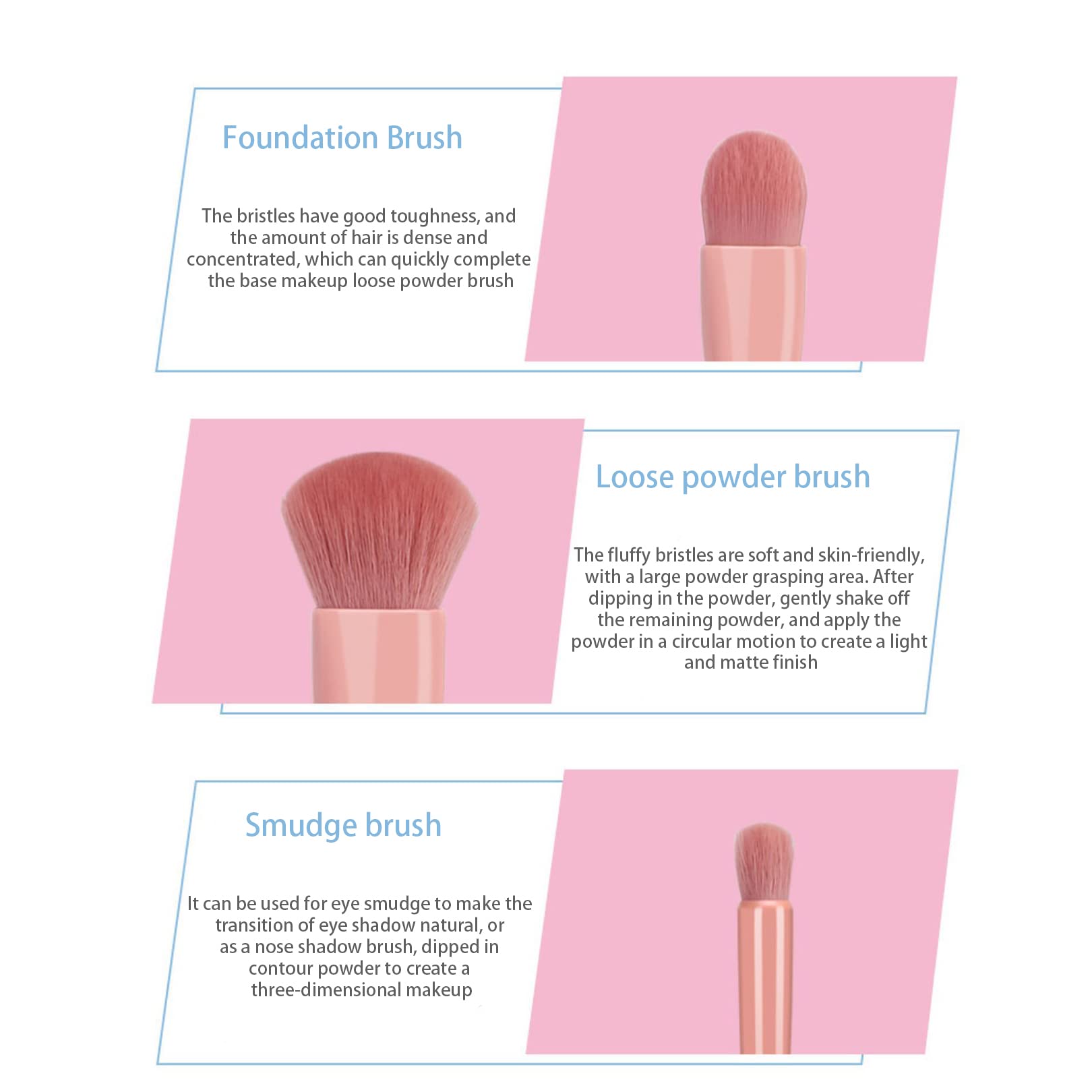 Dense and slender make up brushes are very soft and comfortable to the touch,do not stick to the powder,save the liquid foundation and are more clean and tidy. Long-term use will not cause agglomeration.