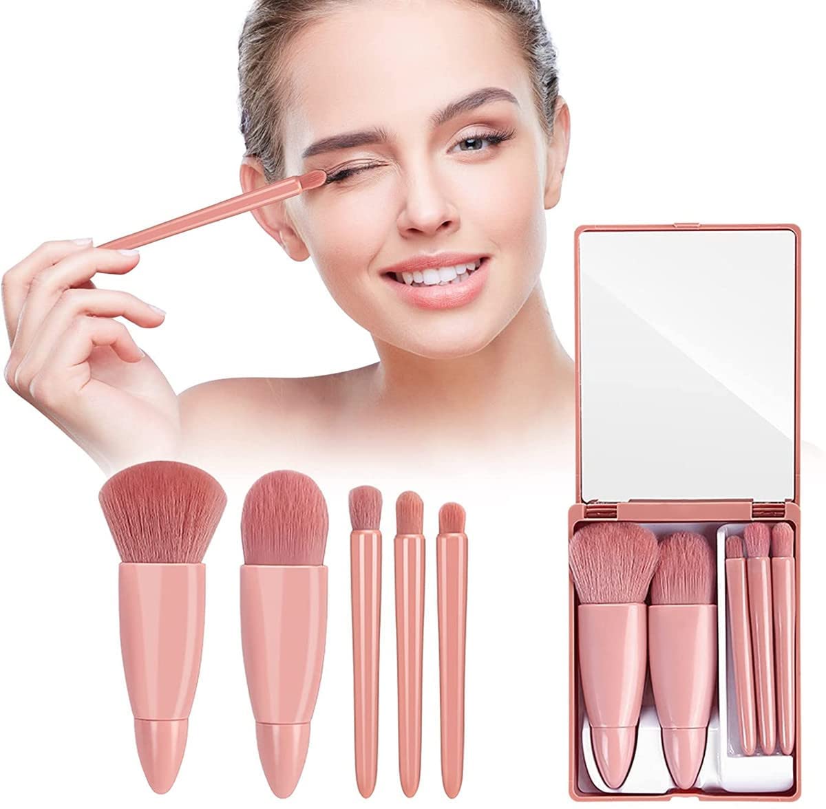 【WHAT WILL YOU GET】Set of multifunctional daily makeup brushes,vanity mirror and five different brush heads to meet makeup needs in all aspects.Elegant and beautiful girls deserve this travel makeup brushes.You will have a natural face and charming eyes after using them.Very suitable for office workers and students.
