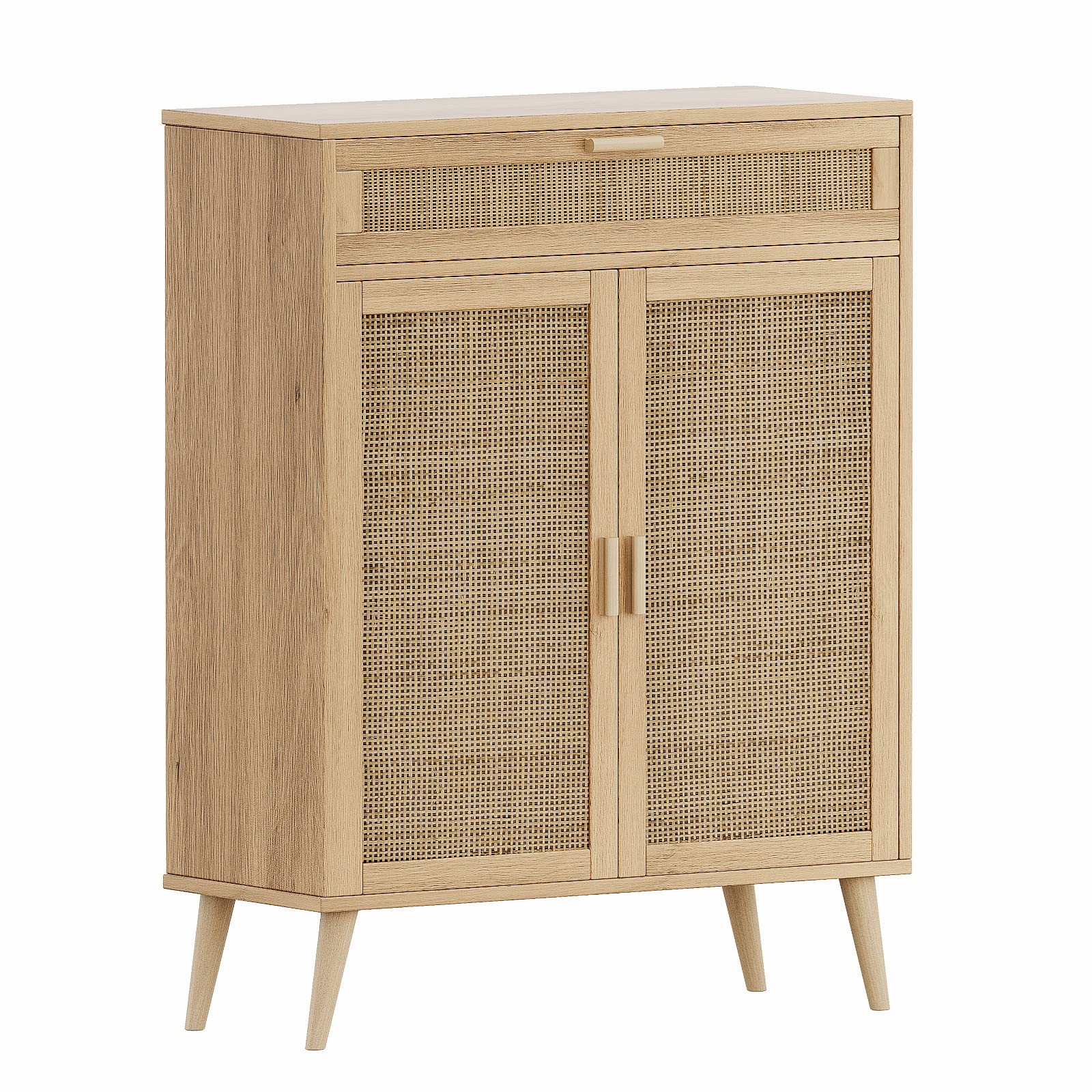 Floor Storage Cabinet with Rattan Doors, Bathroom Cabinet with Large Drawer-Furniture